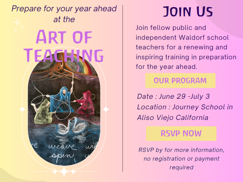 Journey School’s “Art of Teaching” Summer Renewal program is designed for practicing Waldorf teachers in public charters and independent schools, as well as homeschool instructors. For new and seasoned teachers alike, planning for the year can be daunting. This week-long in-person renewal experience is designed to help teachers prepare for the year ahead, deepen their practice and fill their cups.